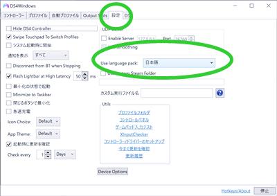 6.英語表記のため「設定」タブの下記箇所を「日本語」に設定しDS4Windowsを再起動すると日本語表記に変わる。